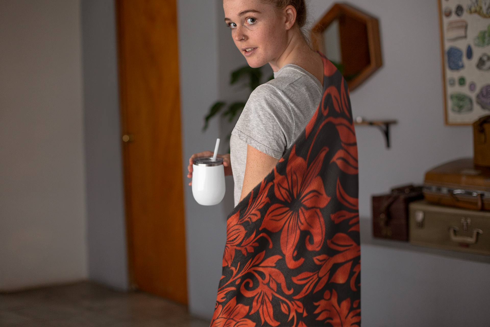This blanket design commands attention with its bold, striking contrast of deep red florals against a stark black background. The vibrant red blossoms and intricate foliage are artistically rendered, creating...