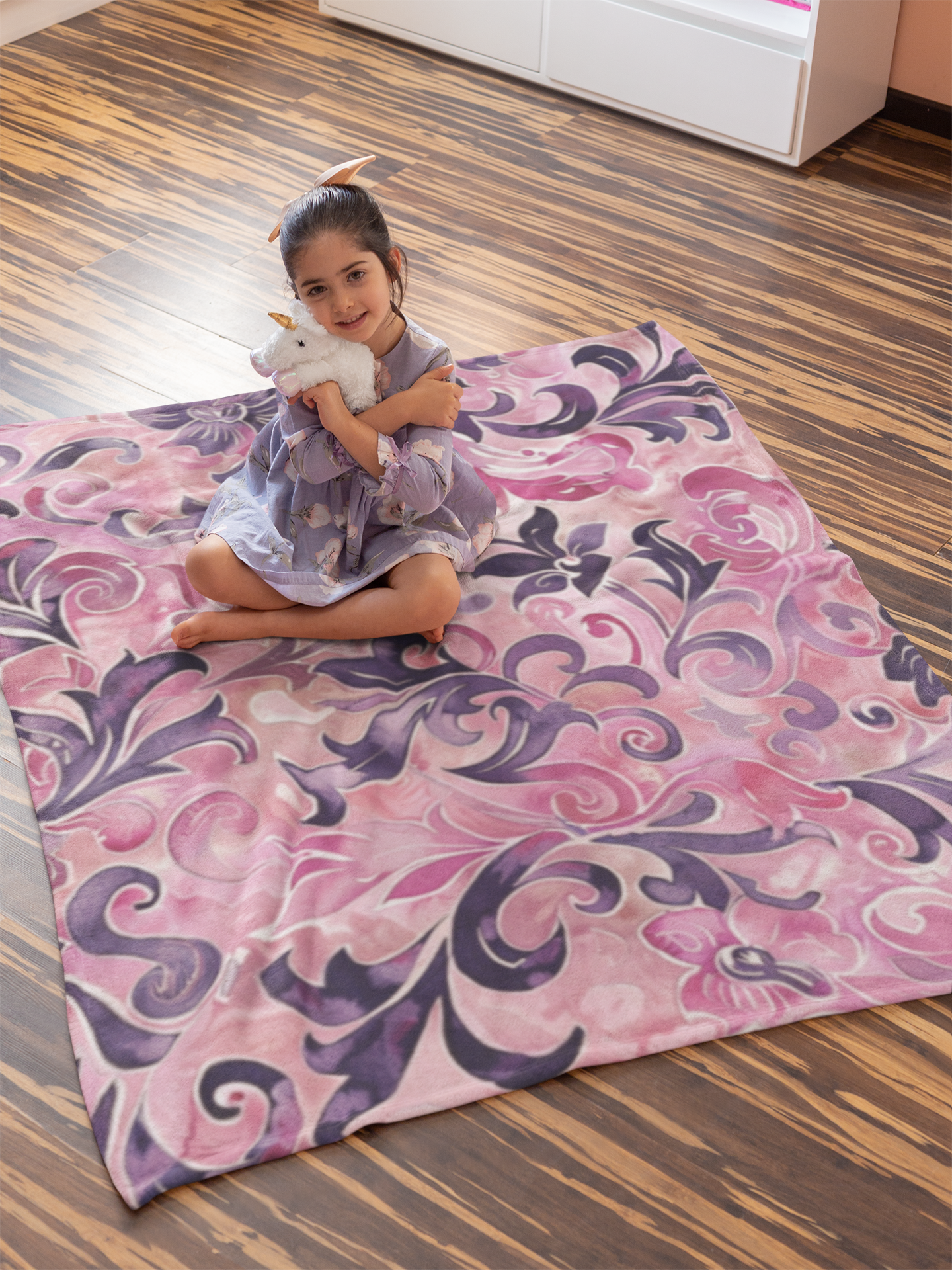 This exquisite blanket design showcases a mesmerizing blend of floral and scroll motifs across a gradient of pink hues, ranging from soft blush to deep magenta. The pattern is characterized...