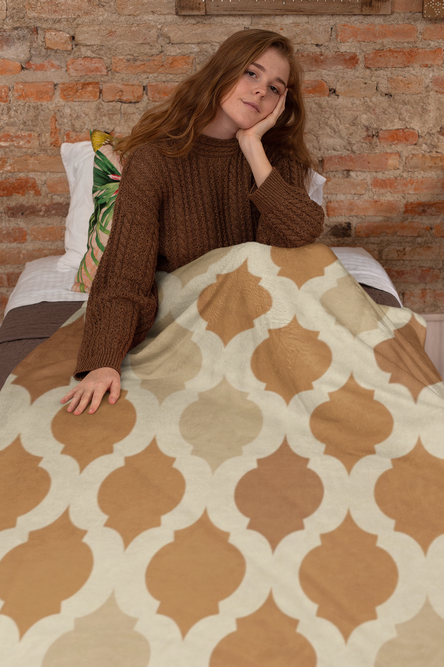This blanket design beautifully showcases the quatrefoil motif in a warm and inviting palette of earth tones, ranging from rich terra cotta to soft beige and deep brown. The repeated...